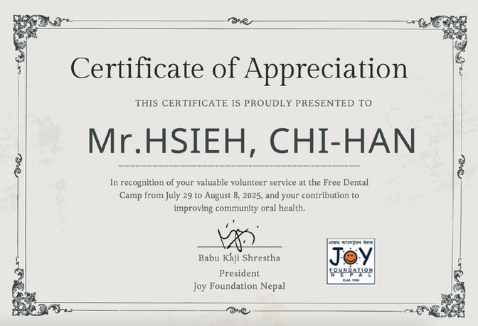 A defining experience for me was joining Taipei Medical University’s dental volunteer program in Nepal. Over the course of the mission, I assisted dentists in providing oral health education and checkups to rural communities, helping educate more than 500 students on the basics of oral health across three schools and monasteries. This opportunity reinforced my commitment to dentistry as a way to expand access to essential healthcare and inspired me to pursue a dental career.
